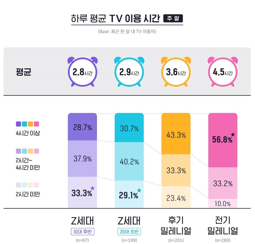 주말 기준 하루 평균 TV 이용 시간은 Z세대(10대 후반 2.8시간·20대 초반 2.9시간)와 전기 밀레니얼(4.5시간) 간 하루 평균 1시간 30분 이상 차이를 보였다. 주말 하루 4시간 이상 이용하는 비율과 비교하면 Z세대(10대 후반 28.7%·20대 초반 30.7%)가 전기 밀레니얼(56.8%)의 절반 수준이었다.