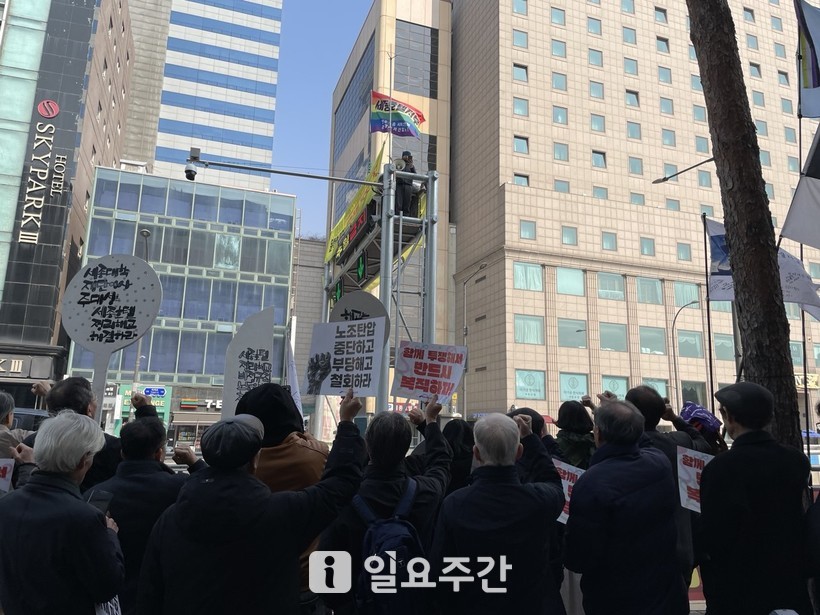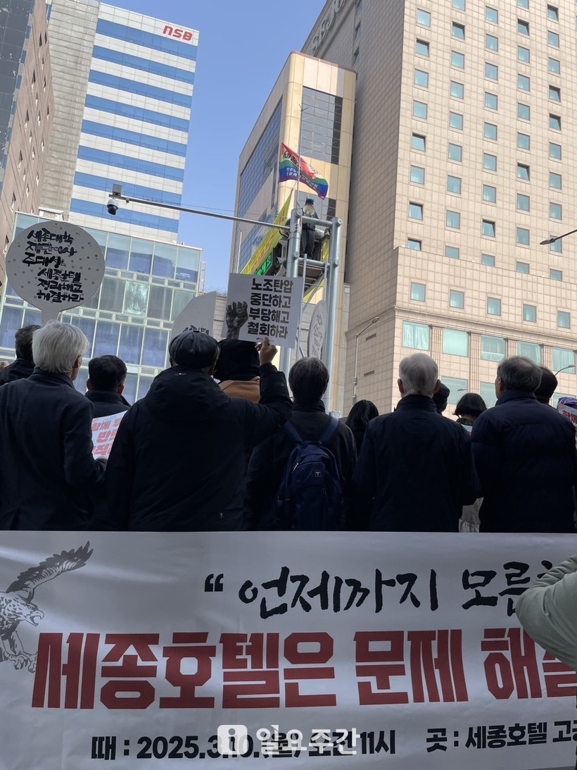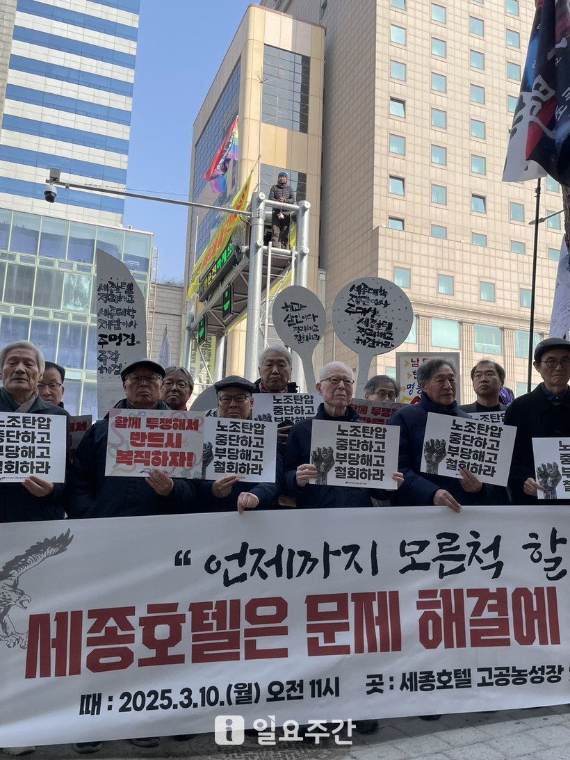 [일요주간=임태경 기자] 15년째 세종호텔(세종대학교 재단인 대양학원이 100% 지분 소유)의 정리 해고에 맞서 복직 투쟁을 벌이고 있는 노동자가 한 달 가까이 고공농성을 벌이고 있다.