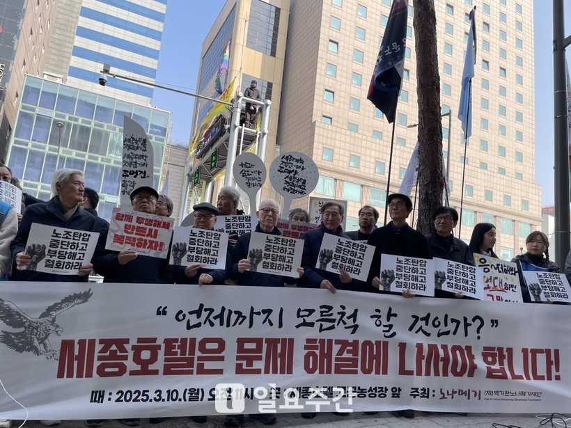 지난 10일 민주노총 고진수 세종호텔지부장이 고공농성 26일째를 맞은 가운데 (재)백기완노나메기재단(이하 백기완재단)은 이날 오전 세종호텔 고공농성장 앞에서 기자회견을 열고 해고 노동자들의 복직을 위해 세종호텔이 문제 해결에 나서 줄 것을 촉구했다.