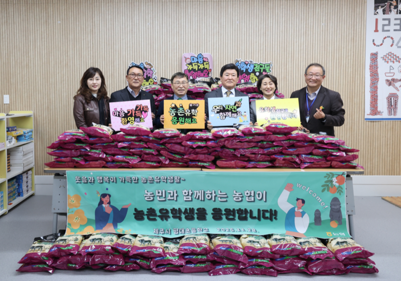 1일 NH농협은행 서울본부에 따르면 지난달 28일 제주도 내 농촌유학 프로그램을 운영 중인 성읍초등학교(서귀포시)와 평대초등학교(제주시)을 찾아 학생들에게 총 1200kg의 쌀을 후원했다.