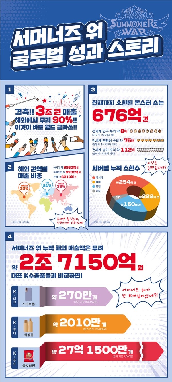 이번 인포그래픽은 현재까지 세계적인 인기를 이어가고 있는 ‘서머너즈 워’의 해외 성과에 초점을 맞춰, 글로벌 대표 K게임으로서의 면모를 입증했다는 평가를 받고 있다.