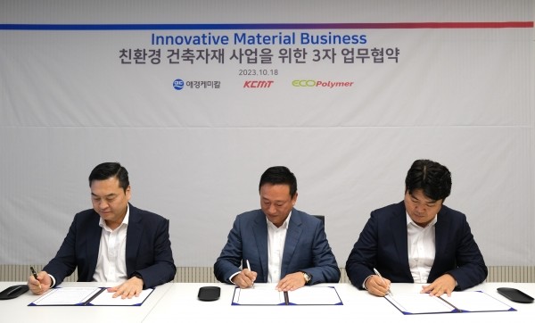 [일요주간 = 이수근 기자] 서울 마포 애경타워에서 18일 애경케미칼(대표 표경원), KCMT(대표 김준영) 및 에코폴리머(대표 심무섭)가 철근 대체 친환경 건축자재 시장에서의 협력을 위한 3자 업무협약을 체결했다.