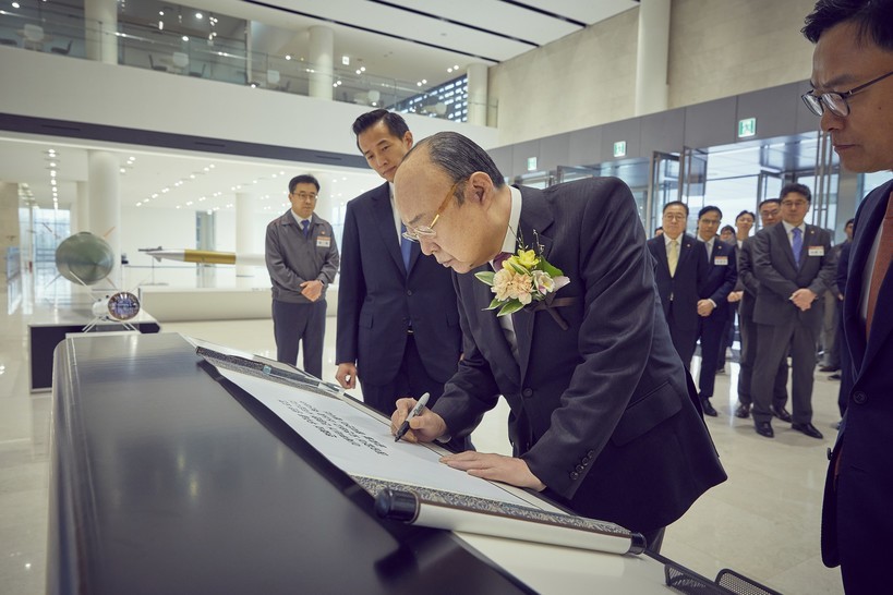 | ▲ 한화그룹 김승연 회장이 한화에어로스페이스 대전 R&D 캠퍼스에 방문해 기념 방명록을 작성하고 있다.(사진=한화그룹 제공) |