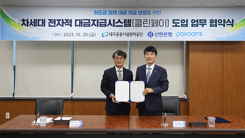[일요주간=김영란 기자] 대구공공시설관리공단(이사장 문기봉)은 10월 20일(금) 신한은행과 올바른 대금 지급 문화정착을 위한 차세대 전자적 대금 지급 시스템 ‘클린페이’ 도입 업무협약(MOU)을 체결했다.