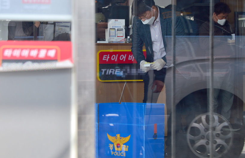 | ▲지난헤 10월 광주 타이어뱅크 OO지점에서 고의로 고객의 차량 휠을 파손하고 부품 교체를 권유한 의혹과 관련해 경찰이 압수수색을 하고 있다.(사진=newsis) |