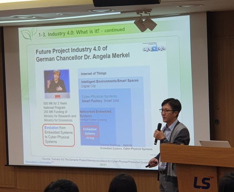 ▲이정준 LS산전 상무가 스마트 팩토리에 대한 최근 이슈에 대해 설명하고 있는 모습. (사진=임베디드소프트웨어·시스템산업협회 제공) |
