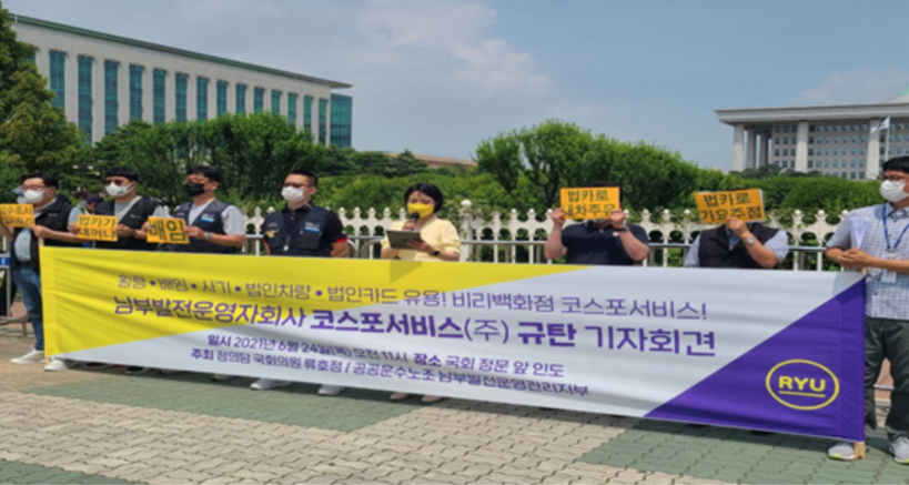 ▲정의당 류호정 의원과 공공운수노조는 24일 오전 국회 정문 앞에서 한국남부발전 자회사 코스포서비스(주)에 대한 감사결과를 발표하는 기자회견을 열었다.(사진=공공운수노조 제공)