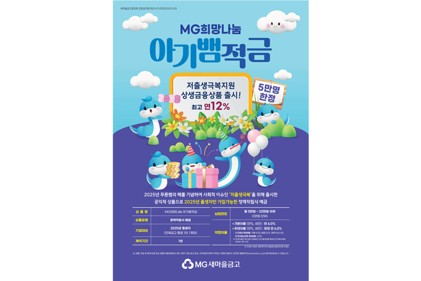 [일요주간=김완재 기자] 새마을금고가 저출생 극복을 위한 사회공헌 금융상품으로 지난 4월 선보인 ‘MG희망나눔 아기뱀적금’이 출시 이후 약 4만7천 계좌 판매를 기록하며 호응을 얻고 있다.