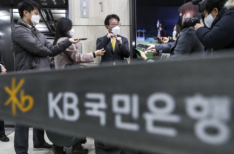 ▲ 이재근 KB국민은행장 내정자가 지난 2일 오전 서울 영등포구 KB국민은행 여의도본점으로 출근하며 기자들에게 둘러쌓여 소감을 밝히고 있는 모습. (사진=뉴시스) |