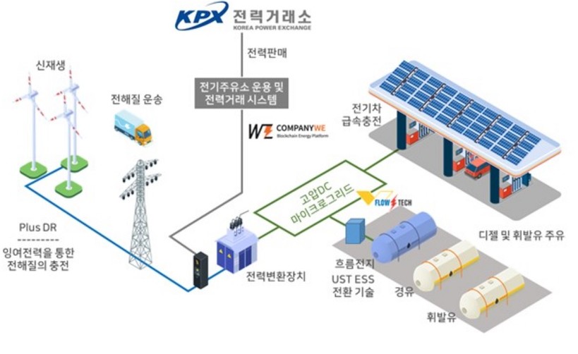 컴퍼니위는 이러한 흐름전지를 활용 기존 주유소 인프라를 활용한 전기 주유소 최적 모델을 개발한다.