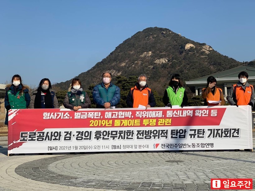 | ▲민주일반연맹 등 노동계와 고속도로 톨게이트 노동자들은 지난 20일 청와대 앞에서 도로공사의 보복성 탄압과 징계를 규탄하는 기자회견을 열었다.(사진 = 김상영 기자) |