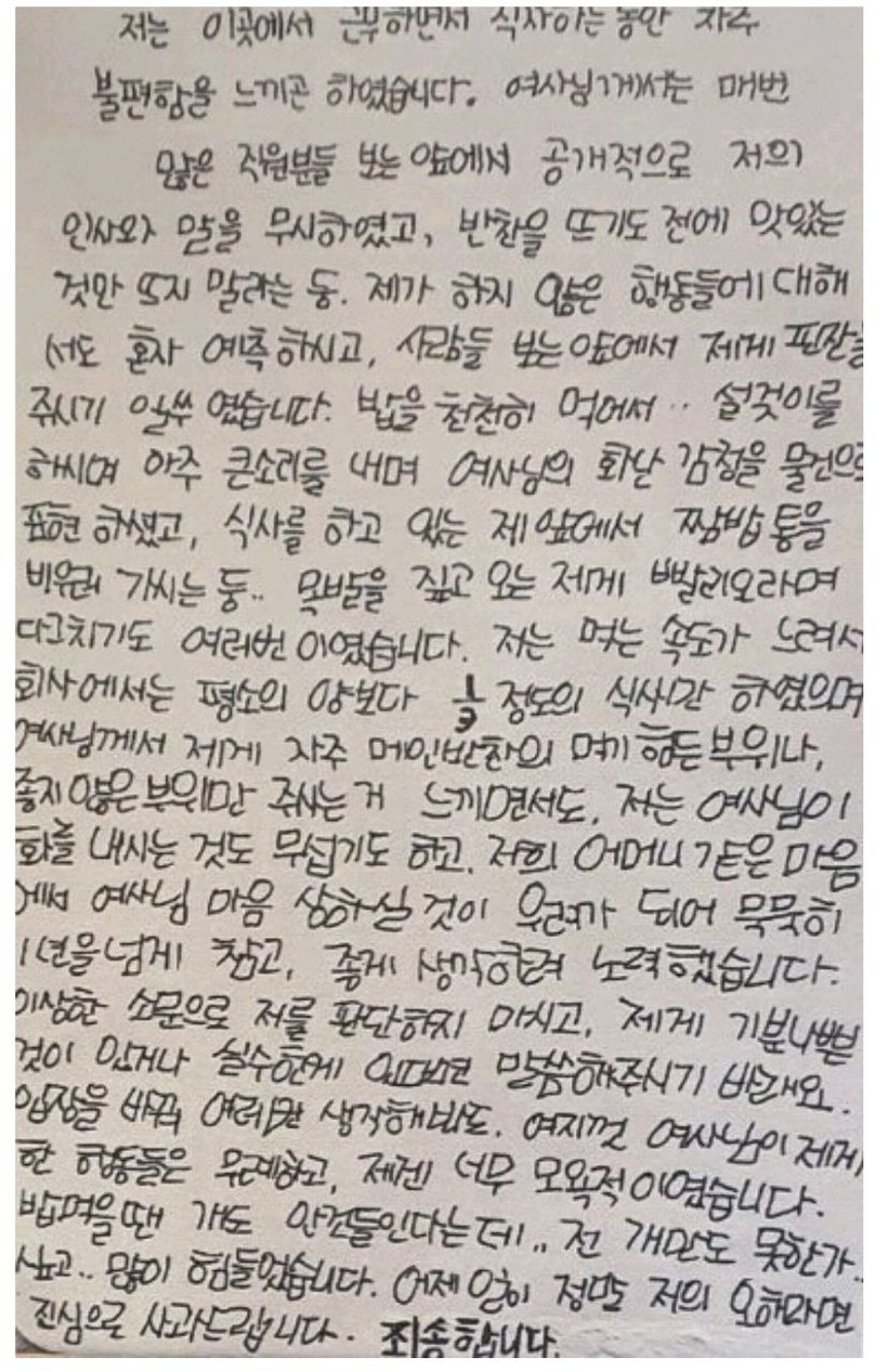 | ▲ A씨가 쓴 호소문.(공공운수노조 제공) |