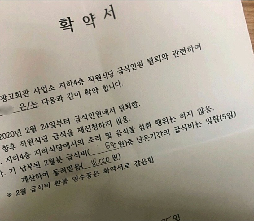 A씨가 감자탕과 관련해 문제를 회사에 제기한 이후 사과는커녕 오히려 직원식당에서 절대 식사할 수 없다는 내용을 담은 확약서에 싸인하라는 강요를 받았으며, 이후 직원식당에 출입을 금지당했다.