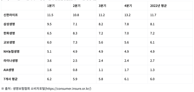 ▲2022년 1~4분기 주요 생명보험사 민원발생률(단위 : 10만 명당 건) |