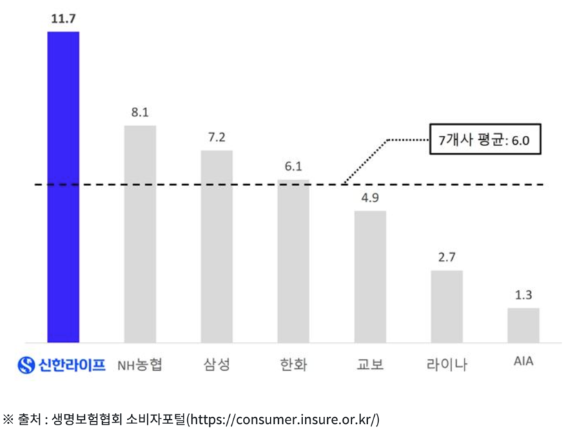 24일 소비자주권시민회의에 따르면 신한라이프의 보유계약 10만 건당 민원건수는 1~4분기 평균 11.7건으로 대형 생보사 7곳 중 가장 높았다. 이는 7개사의 평균인 6.0건의 두 배에 이르는 수치다. 분기별로도 신한라이프의 민원발생률은 모든 분기에서 가장 높았고 7개사 중 유일하게 매 분기 10건을 넘었다.