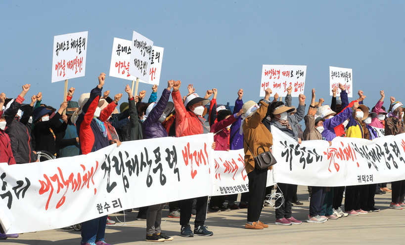 | ▲한림연안자망협회와 해녀 100여명이 지난 4월 20일 오전 제주시 한림읍 한수리 포구에서 집회를 열어 제주시청을 상대로 한림해상풍력 반대를 촉구하고 있다.(사진=newsis) |
