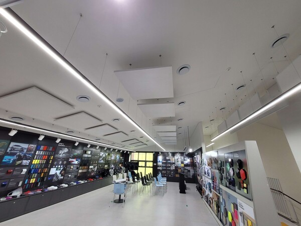 이 제품은 미네랄울을 주원료로 하며 천장재에 적용되는 글라스 티슈를 부착한 원판 표면으로 섬세한 섬유 질감과 함께 흡음성을 확보했다. 특히 NRC 값이 0.5인 천장재 제품인 클라우디아를 활용해 울림을 줄이고 음향 효과를 향상시켜 쾌적한 음환경을 제공한다는 것이 큰 특징이다.