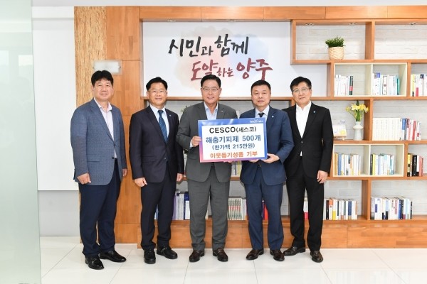 [일요주간 = 이수근 기자] 양주시청에서 지난 21일 이루어진 전달식에서 CESCO(세스코)는 양주시의 저소득 시민들을 위해 해충기피제 500개를 기부하였다. 기피제의 환가액은 약 215만원으로, 이번 기부품은 양주시 내의 사회복지시설에 보내질 예정이다.