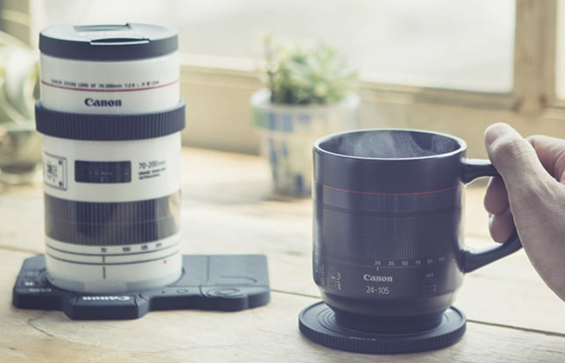 머그잔은 유저들에게 인기 많은 RF 24-105mm f/4 렌즈 디자인으로 세라믹 소재로 만들어졌으며, 텀블러는 EF 70-200mm f/2의 모양새로 머그잔보다 훨씬 길고 백통 렌즈와 흡사하게 보인다.