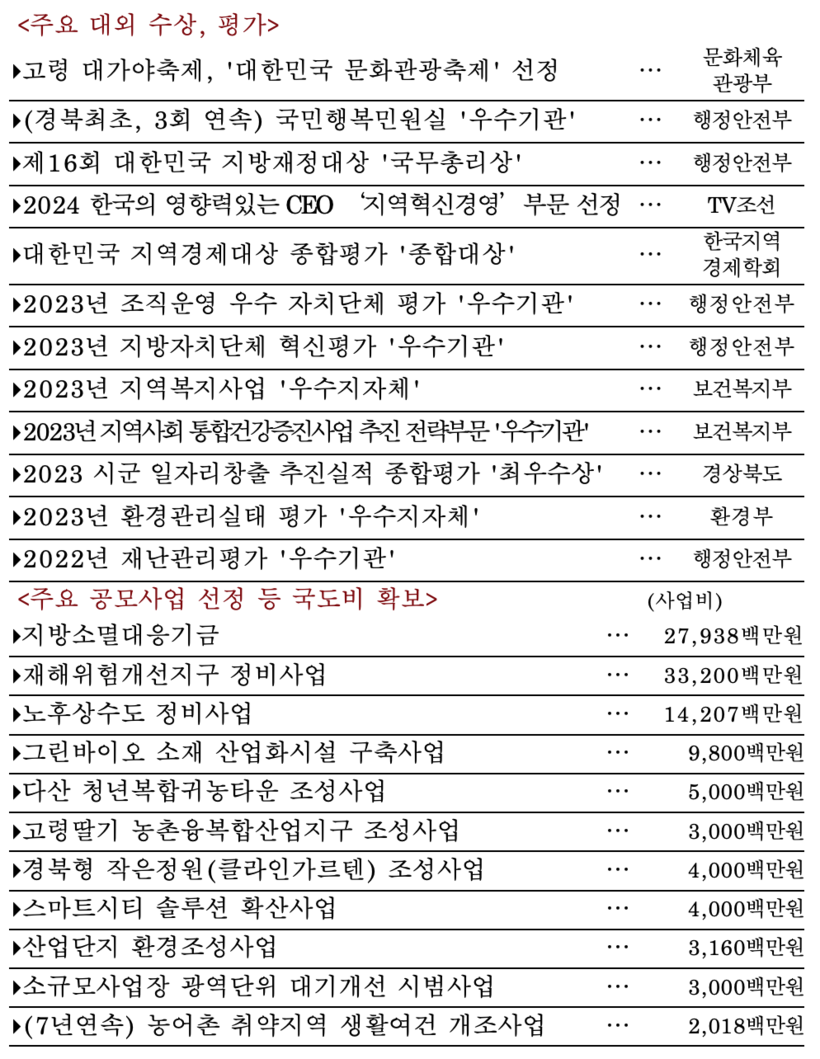 ▲ 고령군 주요 수상 및 공모사업 선정 등 국도비 확보 내역(2022년 7월 ~ 2024년 6월). (사진=고령군 제공) |