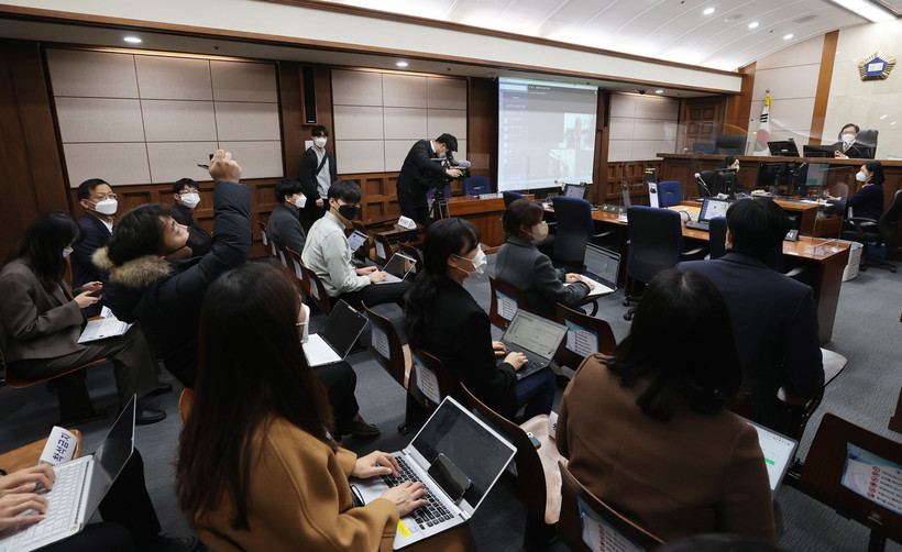 | ▲ 서울 서초구 서울중앙지방법원에서 재판부가 민사 변론기일을 영상재판으로 진행하고 있는 모습. (사진=뉴시스/공동취재단) |