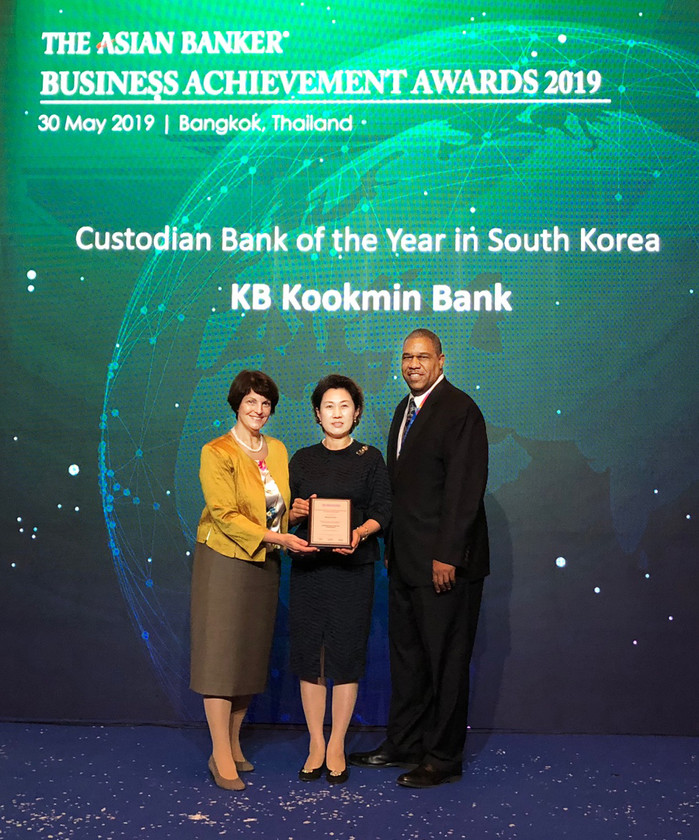 ▲ KB국민은행은 30일 태국 방콕에서 열린 ‘더 아시안 뱅커 비즈니스 어치브먼트 어워드 2019(The Asian Banker Business Achievement Awards 2019)’에서 '한국 최우수 수탁은행(Custodian Bank of the Year in South Korea)'에 5년 연속으로 선정됐다. (가운데)사혜난 KB국민은행 수탁사업부장.(사진=KB국민은행) |