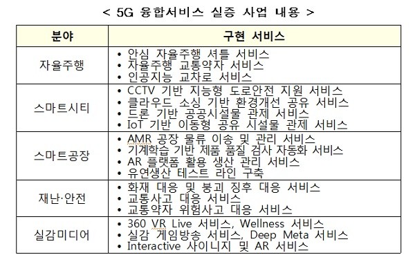 한편, 과기정통부는 2018~2020년간 총 863억원을 투입해 스마트 교통, 스마트 시티, 스마트 공장, 공공 안전 및 실감 미디어 등 5G 융합서비스 실증 시범사업을 추진하고 있다.