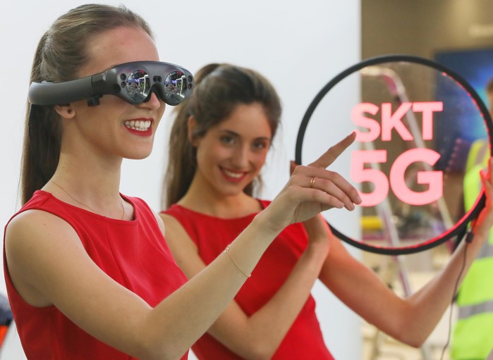 | ▲'MWC19' 개막을 앞두고 스페인 바르셀로나 피아그란비아 전시관 내 SK텔레콤 부스에서 모델들이 SK텔레콤의 5G 기술을 이용한 AR/VR 솔루션 'T 리얼'을 체험하고 있는 모습.(사진=newsis) |