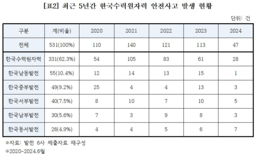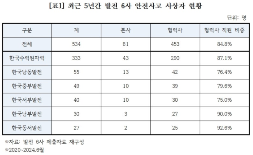 발전 6사 안전사고 '한국수력원자력' 압도적 많아..."333명 중 협력사 직원 290명"2024.10.15