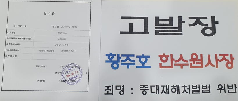 이들 단체는 고발장에서 A 씨의 유서 내용을 근거로 해당 사업주가 사망 책임이 있다며 황주호 사장을 ‘중대재해법 위반으로 고발했다.