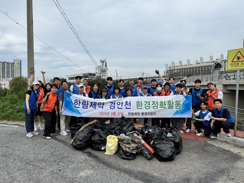 [일요주간=하수은 기자] 한림제약(대표 김정진)은 지난 9월 27일 용인시와 수자원본부가 주관하는 ‘2025년 맑은 하천 사회공헌사업’의 일환으로 용인시 경안천 수포교 인근에서 환경정화 활동을 실시했다고 밝혔다.