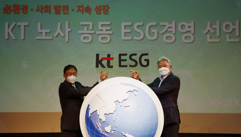 ▲지난해 4월 15일 서울 종로구 KT사옥에서 KT ESG 경영실천을 위한 노사공동 선언식이 열렸다.(사진=newsis) |
