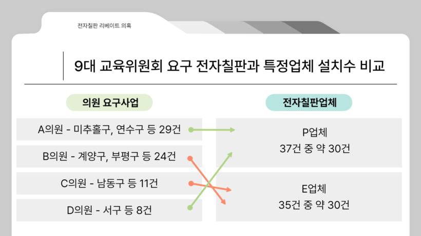 이어 “9대 교육위원회 의원의 인천시교육청 요구사업 중 특정 의원의 전자칠판 보급사업 요구가 특정업체에게 몰렸다”며 “리베이트 의혹을 받는 시의원 4명의 요구사업 중 전자칠판 보급사업은 A의원-미추홀구, 연수구 등 29건, B의원-계양구, 부평구 등 24건, C의원-남동구 등 11건, D의원-서구 등 8건으로 이뤄졌다. 여기서 A의원과 D의원의 요구한 37건 중 약 30건이 P업체, B의원과 C의원이 요구한 35건 중 약 30건이 E업체가 설치한 것으로 드러났다”고 지적했다.