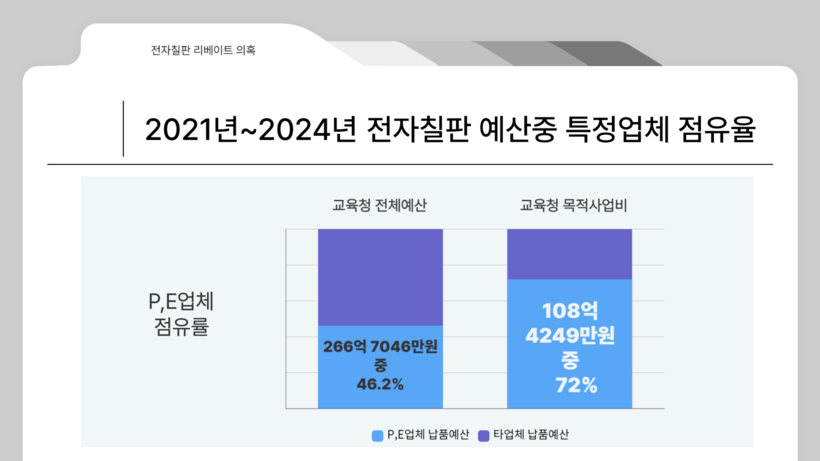 그러면서 “2021년~2024년 전자칠판 설치 예산 중 교육청 목적사업에 두 특정업체들(P업체와 E업체)의 비율이 유독 높다”며 “전자칠판 설치 예산 재원은 266억 7046만 원으로 이 중 시교육청 목적사업비가 약 108억 4249만 원, 학교운영비가 약 158억 2796만 원이다. 이 중 P업체와 E업체 점유율은 전체 예산 266억 중 약 46.2%인 반면 교육청 목적사업으로 한정할 경우 182억의 약 72.0%에 달한다”고 덧붙였다.