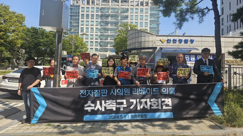 지난 11일 (사)인천교육연구소, (사)인천여성회, (사)청소년인권복지센터내일, 노동자교육기관, 인천교사노동조합, 인천교육정책원, 인천시민사회단체연대, 인천지역연대, 인천평화복지연대, 인천YMCA, 전국교직원노동조합인천지부, 전국보건의료산업노동조합인부천지역본부, 정의당인천시당, 진보당인천시당, 참교육학부모회인천지부 등 15개 사단법인·지역시민단체(이하 인천 시민사회·교육계)가 인천경찰청 앞에서 기자회견을 열고 전자칠판 설치 관련 특정 업체와 인천광역시의원 간의 리베이트 의혹에 대해 수사당국의 엄정한 수사를 촉구했다.