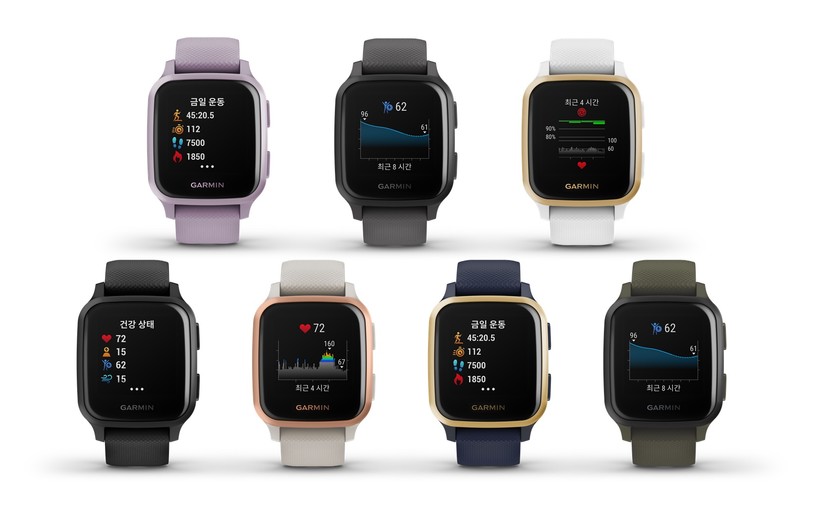 7가지 컬러로 출시된 가민 베뉴 Sq 시리즈는 심박수 및 혈중 산소 포화도 측정 센서도 탑재돼 있다.