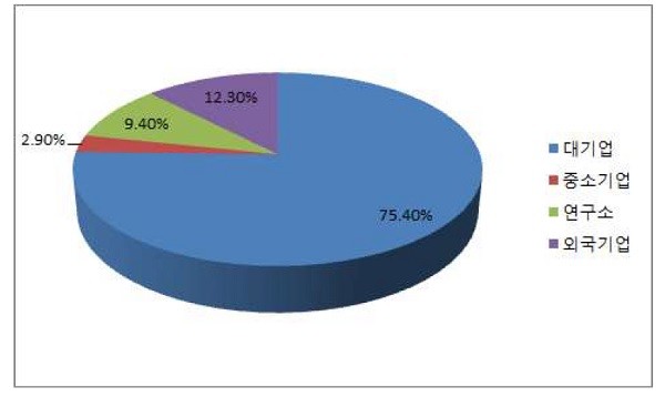 2018년까지의 출원인별 동향을 살펴보면, 대기업이 75.4%로 대부분을 차지했다. 이어 외국기업과 연구소 비율은 각각 12.3%, 9.4%였고, 중소기업의 비율은 2.9%에 불과했다.