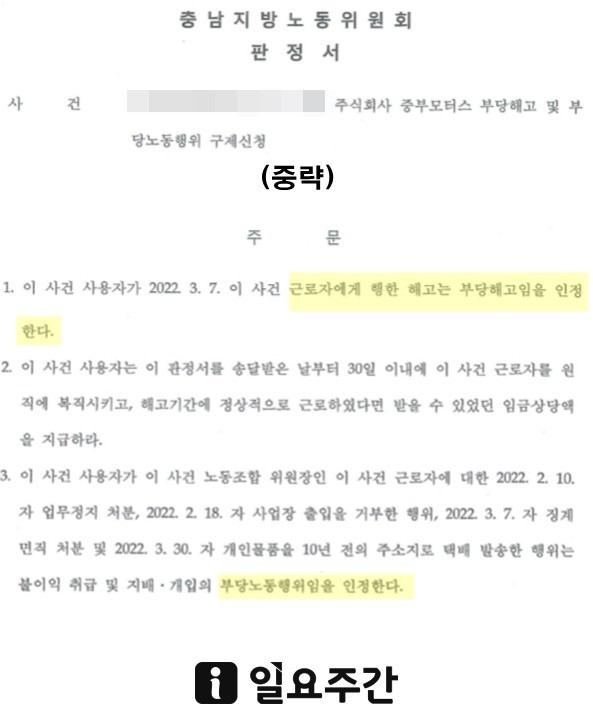 실제 충남 지방노동위원회는 이 사건에 대해 지난 5월 2일 구제명령과 함께 “이 사건 사용자(중부모터스)가 이 사건 노조위원장(최승훈)에 대한 2월 10일 업무정지 처분, 2월 18일 사업장 출입을 거부한 행위, 3월 7일 징계 면직처분 및 3월 30일 개인 물품을 10년 전 주소지로 택배 발송한 행위는 불이익 취급 및 지배·개입의 부당노동행위임을 인정한다”라고 판정한 바 있다.