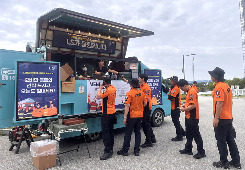 ▲ LS가 9일(화), 강릉 강북공설운동장 인근에서 소방공무원들에게 감사의 뜻을 전하기 위해 커피차를 운영하고 있다.(사진=LS)