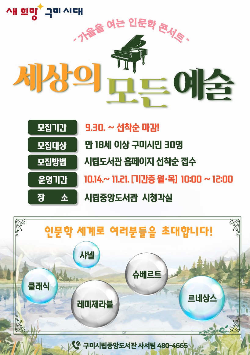 [일요주간=최부건 기자]  구미시립중앙도서관이 ‘가을을 여는 인문학’이라는 주제로 ‘세상의 모든 예술’강좌 수강생을 모집한다. 이번 강의는 오페라, 클래식, 시네마 등 다양한 예술 분야를 아우르며, 구미시민 누구나 신청 가능하다.
