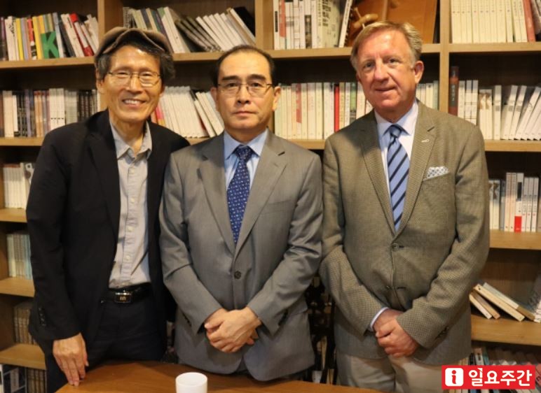 ▲ 전 영국주재 북한대사관 태영호 공사(가운데), ‘붉은 왕조’ 저자인 ‘파스칼 다예즈 뷔르종’(오른쪽)과 함께 |