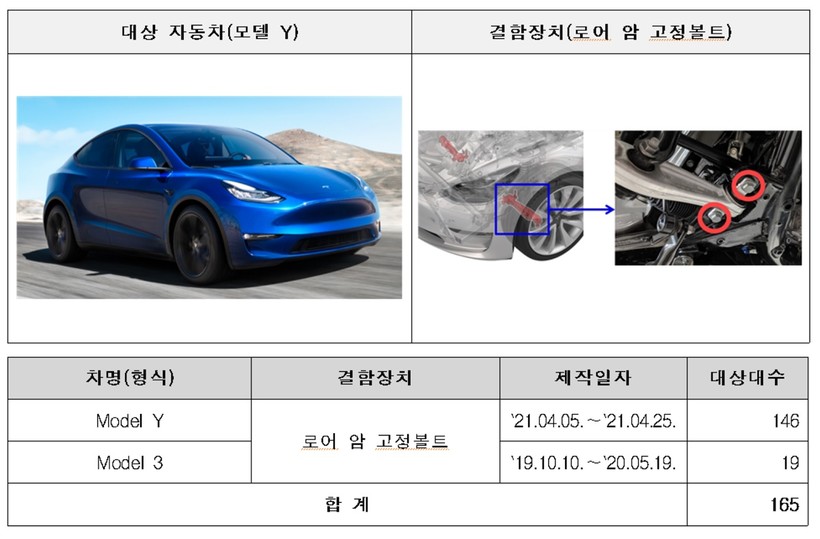 18일 국토교통부에 따르면 우선 테슬라코리아의 모델 Y 등 2개 차종 165대는 앞바퀴 현가장치 내 부품의 고정볼트 체결 불량으로 주행 중 조향 등이 제대로 되지 않아 사고가 발생할 가능성이 확인돼 자발적으로 리콜에 들어간다.