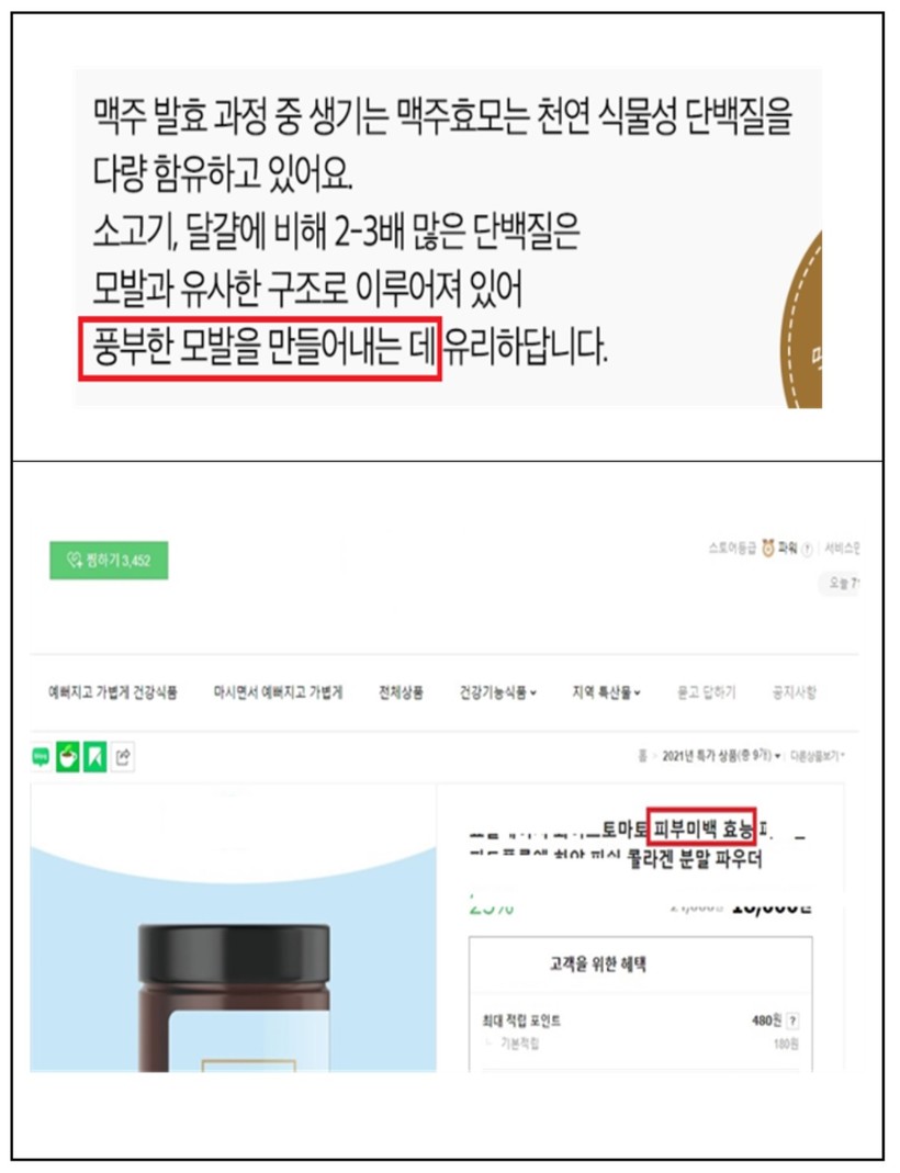 또 일반 식품(기타가공품)을 ‘피부건강’, ‘피부보습’, ‘모발영양제’ 등으로 광고해 건강기능식품으로 오인·혼동하게 했고, 일반 식품에 ‘풍부한 모발’, ‘피부미백 효능’ 등으로 거짓·과장 광고했다.