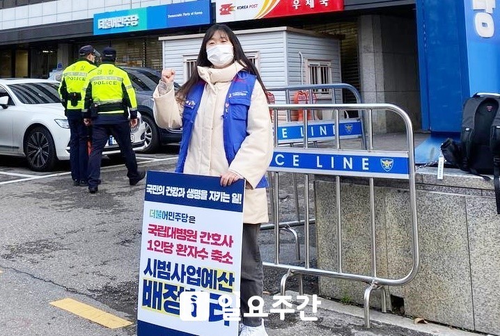▲현지현 공공운수노조 의료연대본부 집행위원장이 국립대병원 간호사 1인당 환자수 축소를 요구하는 1인 시위를 진행하는 모습. <사진=의료연대본부 제공> |