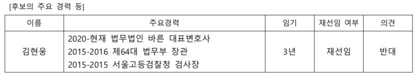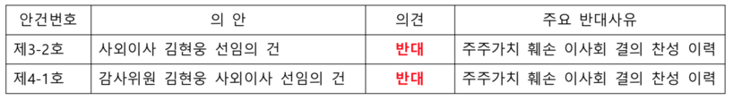 CGCG는 "주주가치를 침해하는 부당한 이사회 결의에 찬성한 이사의 경우 이사로서의 충실의무를 다하지 못한 것으로 판단해 반대를 권고하고 있다"면서 주주가치 훼손 이사회 결의에 찬성한 이력이 있는 김현웅 후보의 감사위원 선임에 반대를 권고했다.