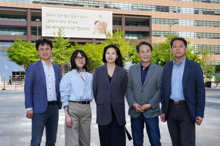 ▲ 왼쪽부터 장재선 문화일보 부국장, 가수 겸 작가 요조, 김행숙 시인, 이승우 소설가, 곽효환 시인. (사진=교보생명 제공)