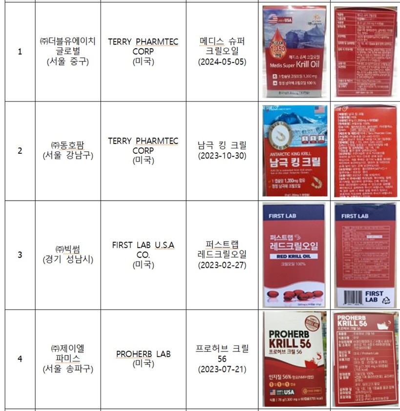 해당 제품은 ▲메디스 슈퍼 크릴오일(더블유에이치글로벌) ▲남극 킹 크릴(동호팜) ▲퍼스트랩 레드크릴오일(빅썸) ▲프로허브 크릴(제이엘 파미스) ▲천호엔케어 프리미엄 크릴오일 1000(푸치니) ▲로얄 크릴오일(홀라이프) ▲남극 크릴오일 1300 골드(그린뉴트리 코리아) ▲웰 파워크릴1350(보령메디) ▲크릴오일(아포스캐리) ▲메가 크릴오일1200(엘엔비내츄럴) ▲이지 레드 크릴(이지메디칼) ▲트루맥스 크릴 1350(제이에스헬스케어) ▲안타티카 크릴오일(아워네이처: 현 헬로바이오) ▲프리미엄 레드 크릴오일(휴젠팜) ▲웰빙 크릴오일 1200(에이스팜) ▲남극파워크릴(이알엠) ▲56플러스 크릴오일(한미통상) ▲원데이 크릴 1200(세움커머스) ▲에크미 파워 크릴오일(제이에스헬스케어) ▲트루웰 크릴오일 1300(파미스코리아) ▲이지 크릴 오일(이지메디칼) ▲남극 크릴오일 1200 골드(미래바이오)다.