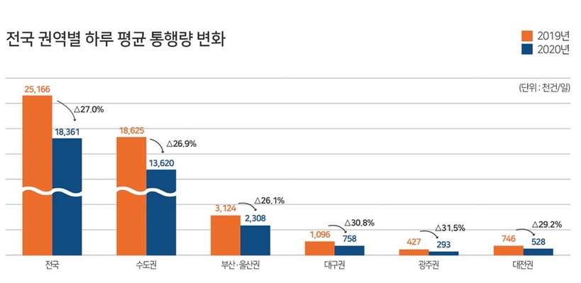 | ▲ 전국 권역별 하루 평균 통행량 변화. (사진=국토교통부) |