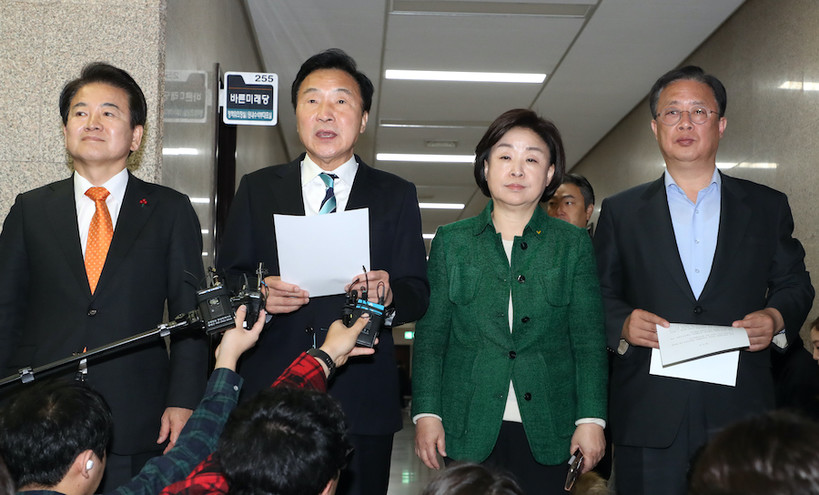 이른바 '3+1' 범여권 협의체에 참여하고 있는 손학규 바른미래당 대표, 심상정 정의당 대표, 정동영 평화당 대표, 유성엽 대안신당 대표는 이날 오전 서울 여의도 국회에서 비공개 회동을 가진 뒤 합의문을 발표했다. 이들은 합의문에서 "한국당의 의회주의 파괴행위와 민주당의 무책임한 버티기 행태에 깊은 유감을 표한다"고 했다.