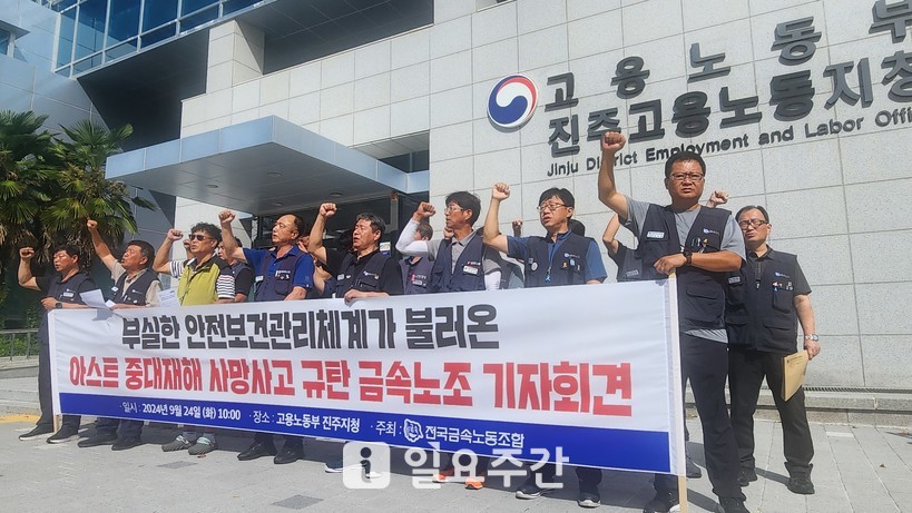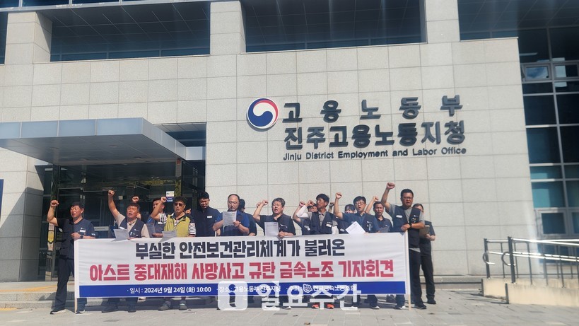 이와 관련 지난 24일 전국금속노동조합(이하 금속노조)은 진주고용노동청 앞에서 기자회견을 열고 안전보건관리 소홀로 노동자가 사망했다며 안전대책 수립을 촉구했다.